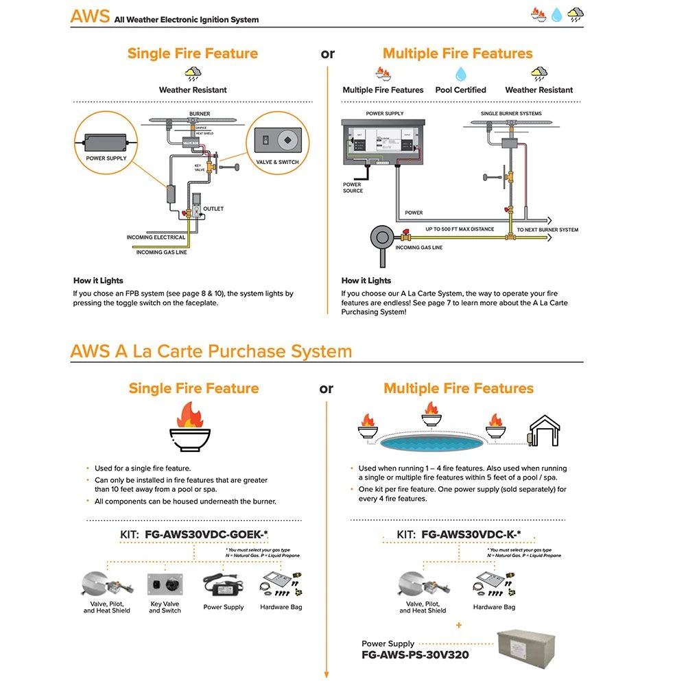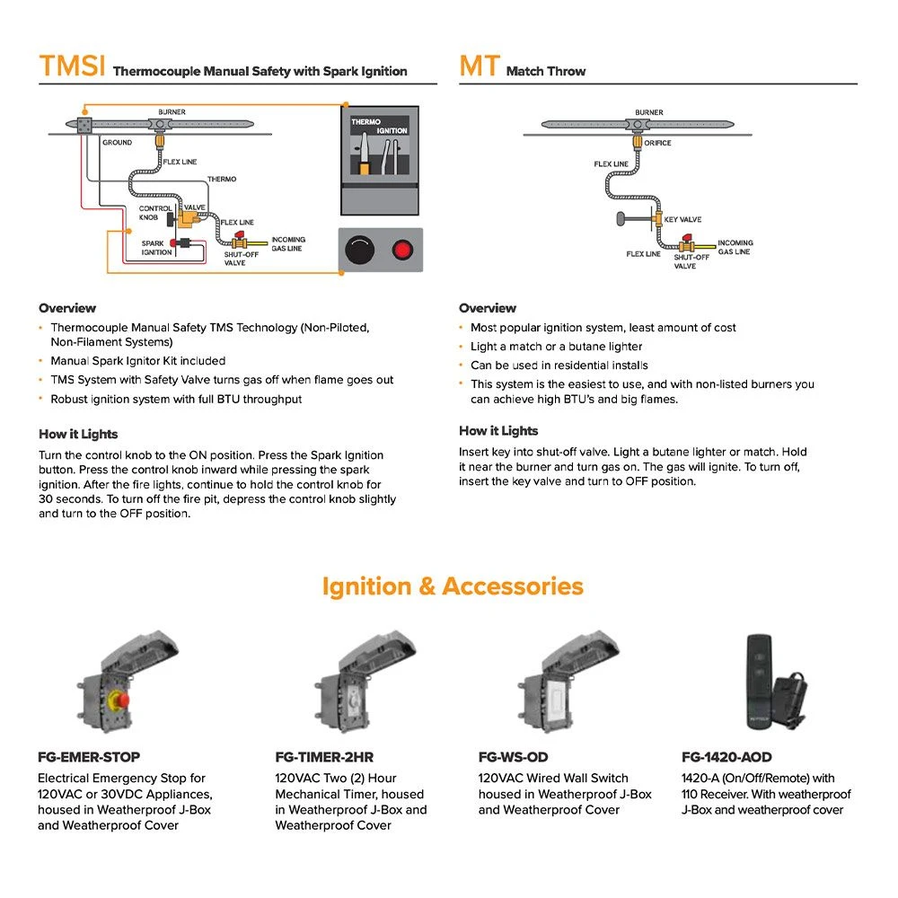 This unit offers the choice of a Match Throw (MT) burner system, a premium Thermocouple Manual Safety with Spark Ignition (TMSI), or an All-Weather Electronic Ignition (AWS). The MT system provides a more cost-efficient fire pit option, while the TMSI system offers added safety and convenience, and the AWS ignition features pool certification, full flame control, and additional customizability.