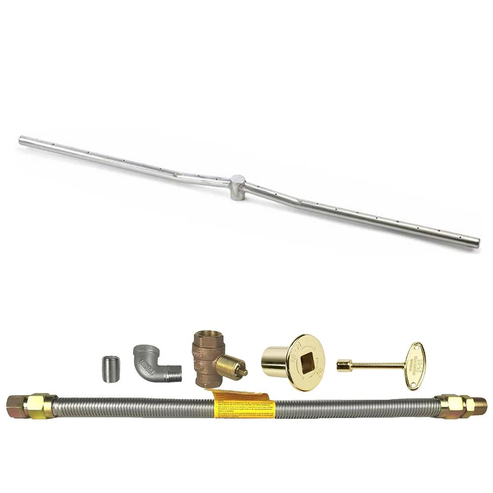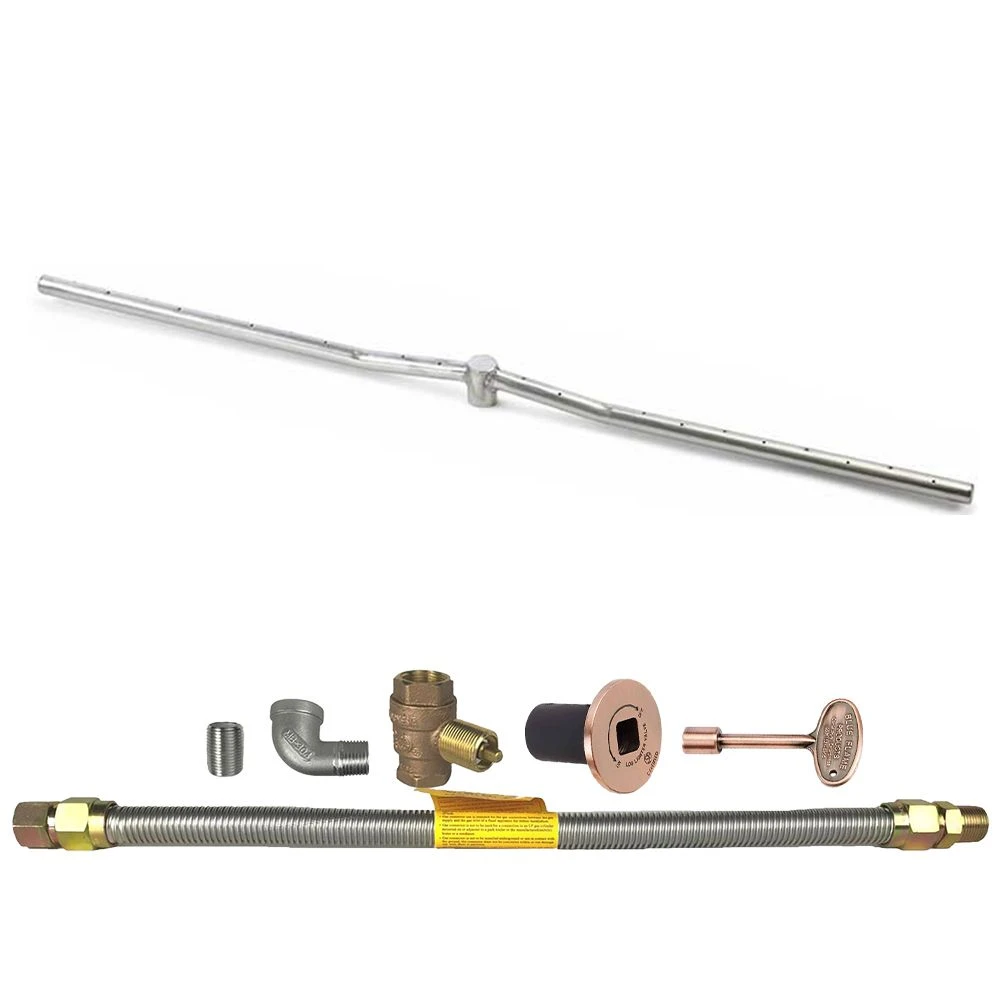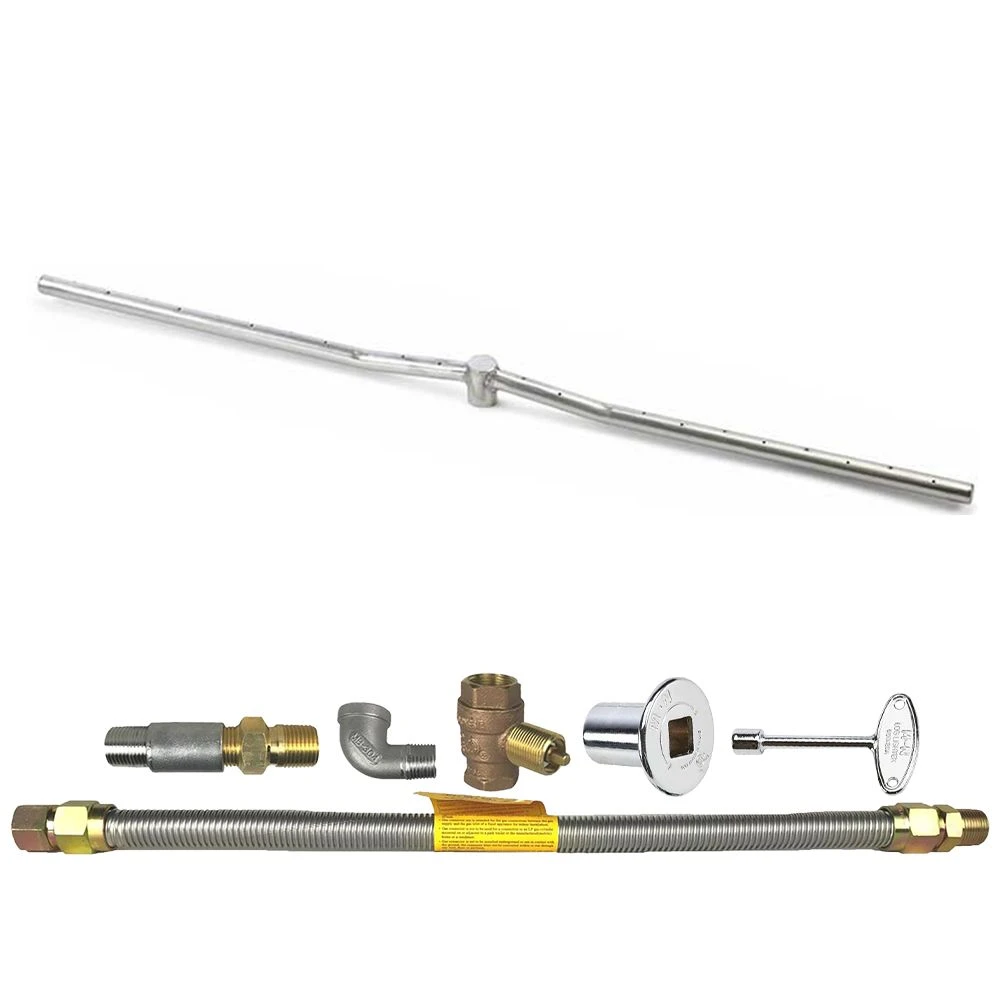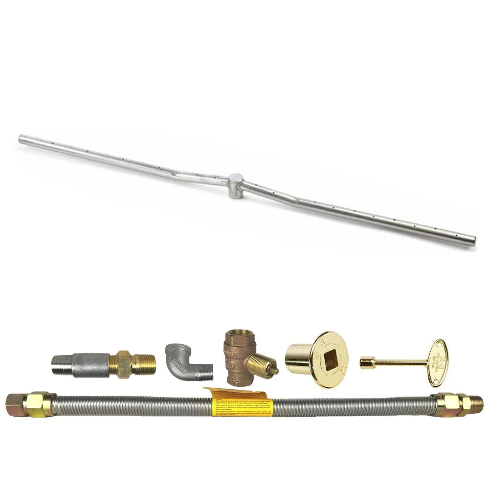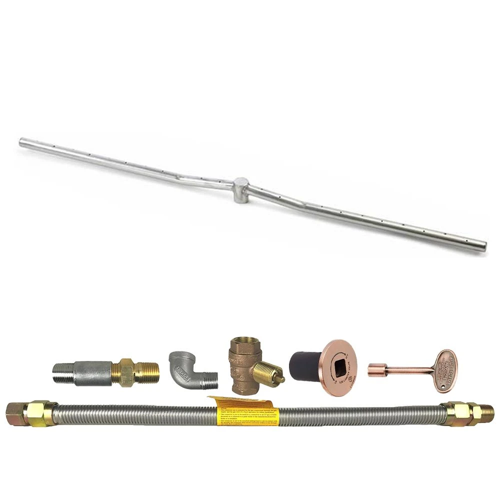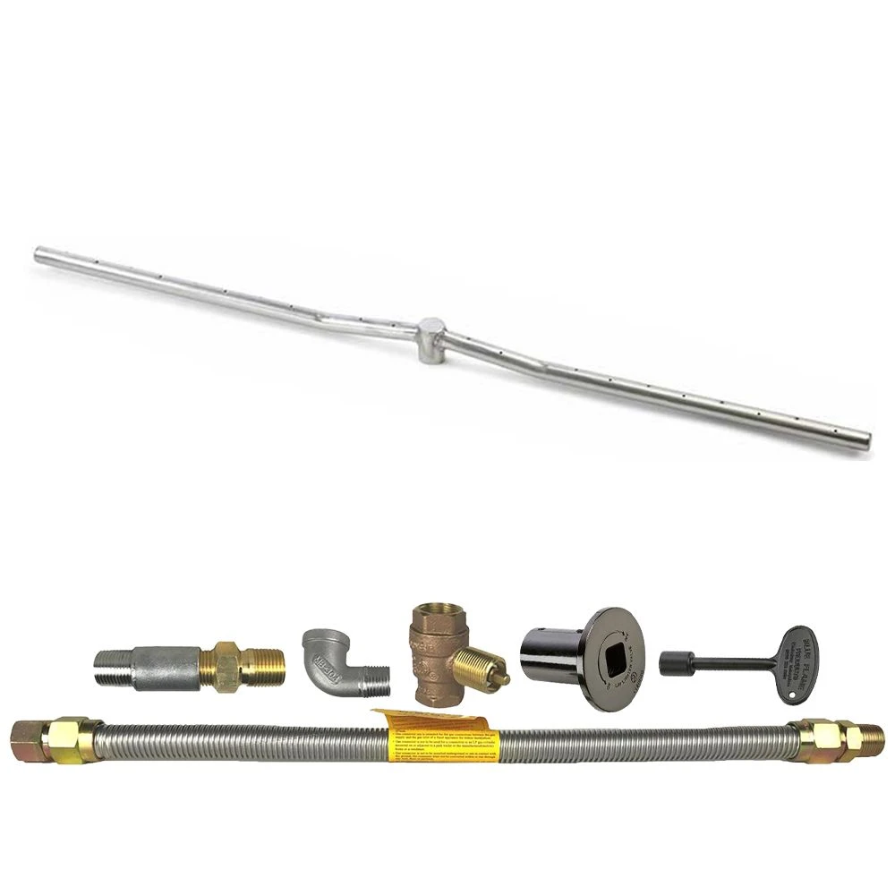 This burner can be installed DIY or by a professional installer and can be used for either Natural Gas or Propane applications; for LP applications a propane conversion kit, which includes an air mixer, coupler & nipple, will be necessary. The burner must be installed so the burner ports face upwards. The kit components include a stainless steel gas flex line, quarter-turn ball valve, decorative flange & key, and stainless steel fittings; the fully assembled kit will complete the burner assembly from the burner to the shut off valve.
