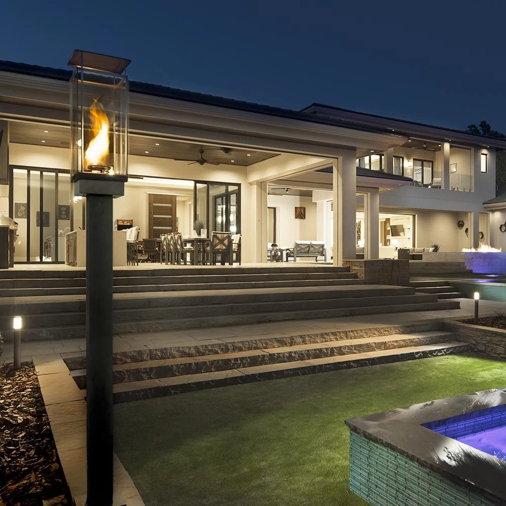 The Tempest Torch can be purchased with either a simple piezo spark igniter or a 24V electronic ignition to meet the needs of your installation. If purchasing electronic ignition, the 24V transformer is required (sold separately) and can power up to six torches The transformer can be located up to 1,000 feet from a single torch or approximately 100 feet from a group of six torches. Up to five transformers can be installed on one 120-volt, 15-amp circuit. The electronic ignition model can be used with a light switch, remote control, programmable timer switch or a smart home system (all control options sold separately).