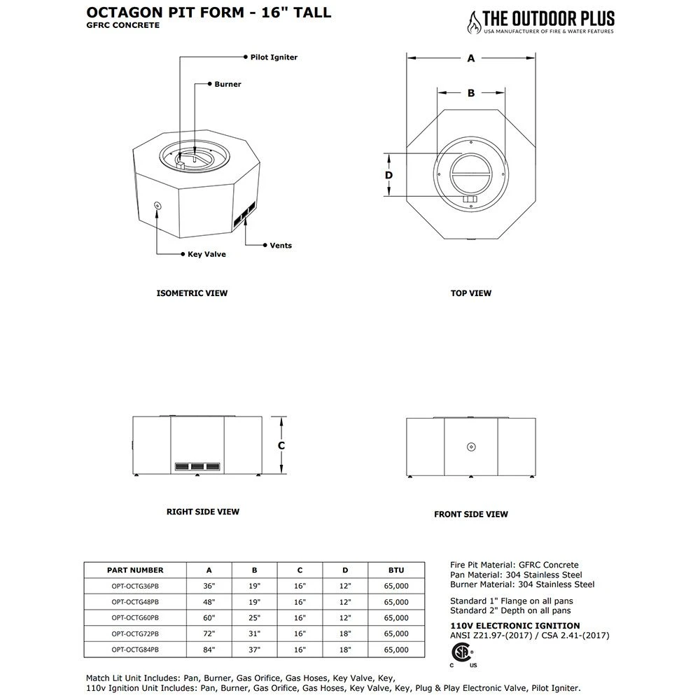 This partially finished 72-inch octagon-shaped fire pit form comes complete with a 31-inch drop-in burner pan, 24-inch burner, key valve, whistle free hoses and a stainless steel air vent to make complete installation as easy and safe as possible. This fire pit package allows you to choose from Match Light, Spark, 12V or 110V Electronic ignition options and comes with or without a propane tank door depending on your needs. Choose from the options above and make your patio dreams come true!