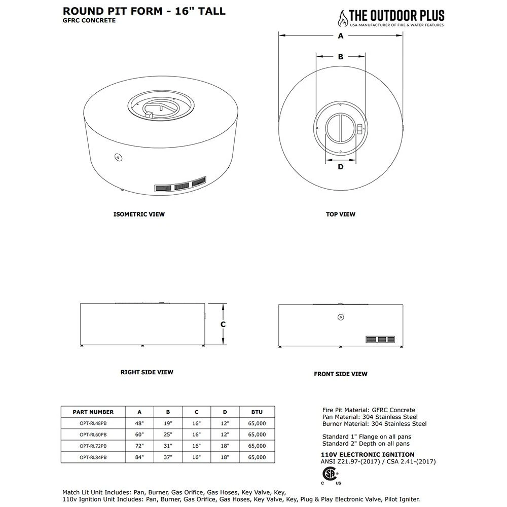 This partially finished 72-inch round fire pit form comes complete with a 31-inch drop-in burner pan, 24-inch burner, key valve, whistle free hoses and a stainless steel air vent to make complete installation as easy and safe as possible. This fire pit package allows you to choose from Match Light (with or without Flame Sense), Spark, 110V Electronic or 12V Electronic options and comes with or without a propane tank door depending on your needs. Choose from the options above and make your patio dreams come true!