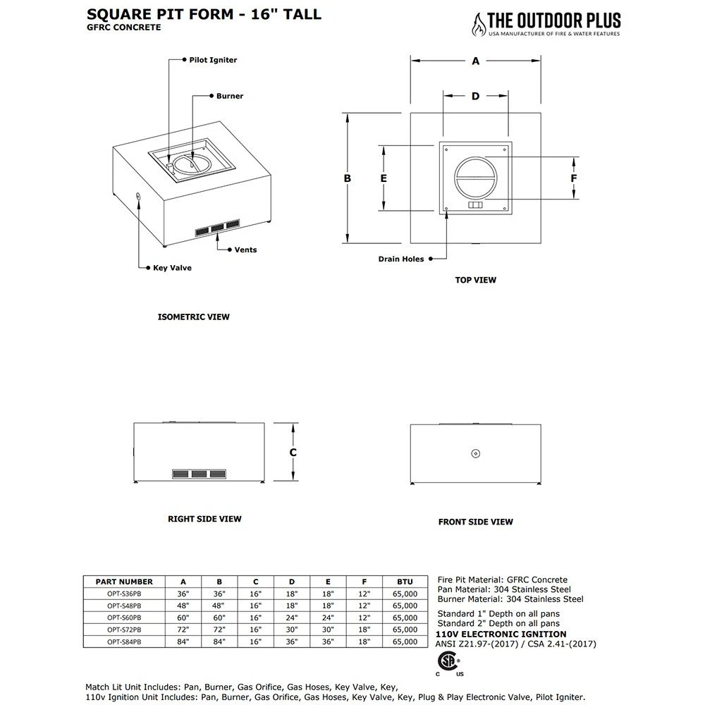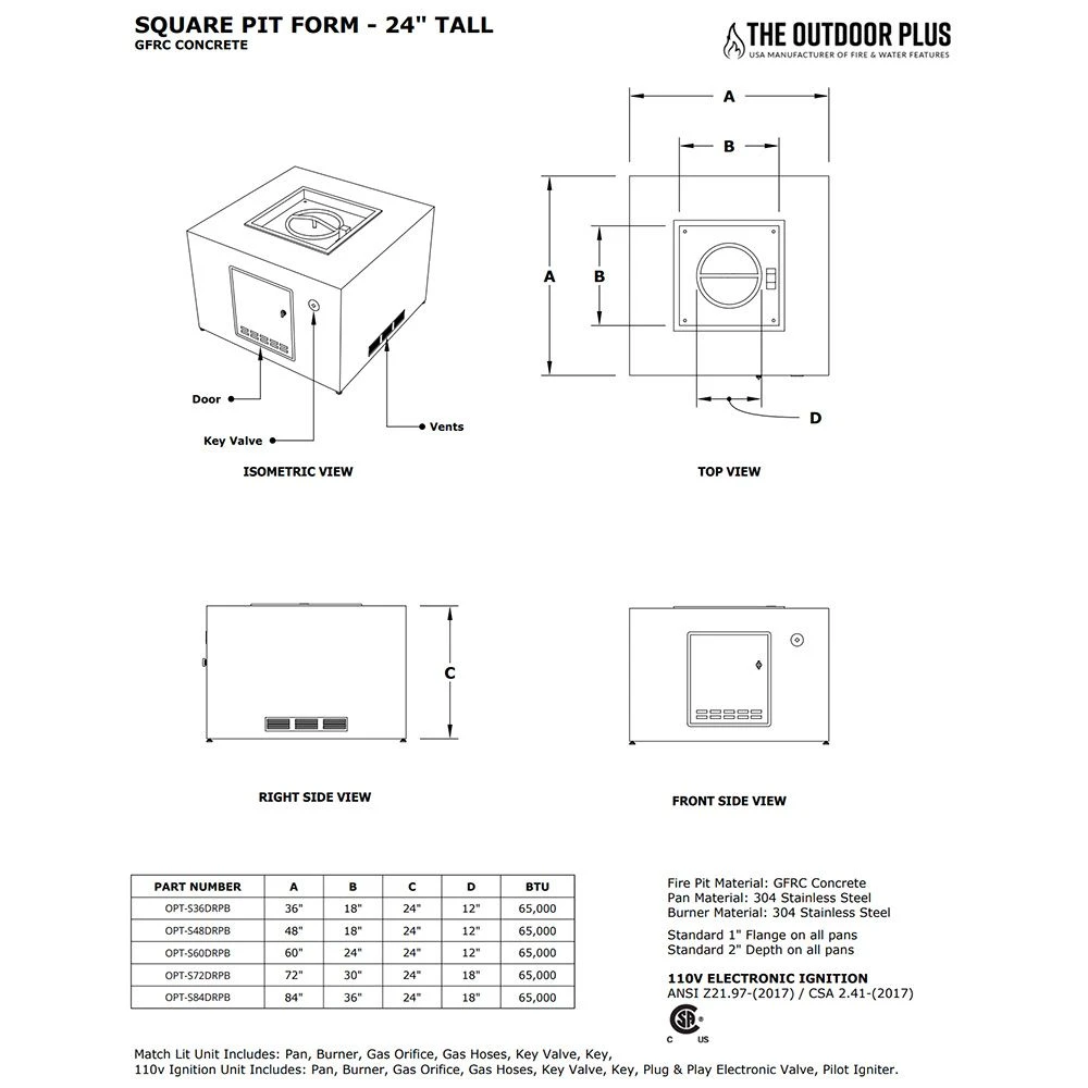 This partially finished 48-inch square fire pit form comes complete with a 24×24-inch drop-in burner pan, 18-inch burner, key valve, whistle free hoses and a stainless steel air vent to make complete installation as easy and safe as possible. This fire pit package allows you to choose from Match Light (with or without Flame Sense), Spark, 110V Electronic or 12V Electronic options and comes with or without a propane tank door depending on your needs. Choose from the options above and make your patio dreams come true!